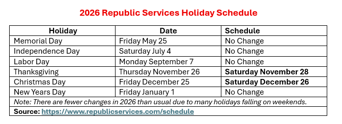 You can find the holiday pickup schedule on the right or download it directly from Republic Services.